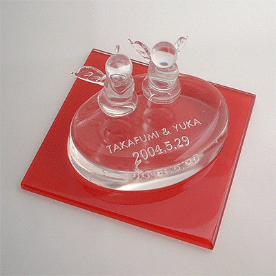 天使の首に指輪を掛けるタイプのガラス製リングピロー。二人のお名前&記念日を彫刻。